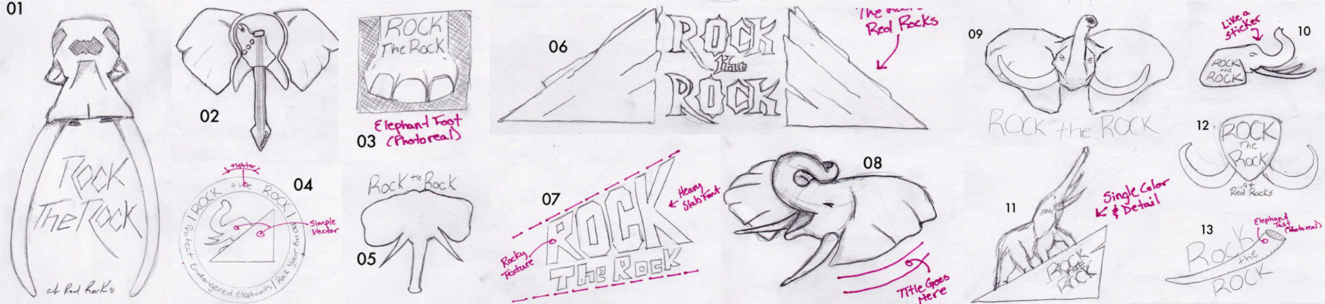 Early sketching explored the potential visual identity of this event from multiple angles, but ultimately saw the identity possibilities pared down to items 01, 02, and 06 seen in the sketches below. All the ideated options may have been viable, but these were the most likely to elicit the positive response sought.